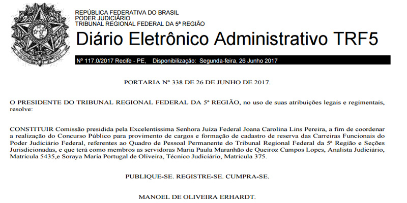 Vem aí um novo concurso no TRF da 5ª Região (concurso TRF-5). O Tribunal Regional Federal que abrange os estados de Alagoas, Ceará, Paraíba, Pernambuco, Rio Grande do Norte e Sergipe terá uma nova seleção de pessoal em breve. É o que informa o Diário Eletrônico Administrativo do TRF 5, publicado em 26 de junho, que formou a comissão para realização do novo certame.